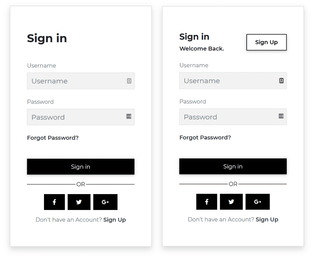 ngOnInit(): void {}}<CDBCard class="shadow"> <CDBCardBody class="p-5"> <div class="mt-4 mb-5"> <p class="h2 font-weight-bold">Sign up</p> </div> <label htmlFor="defaultRegisterUsername" class="text-muted m-0"> Username </label> <CDBInput id="defaultRegisterUsername" [background]=true hint="Username" class="mt-n3" type="text"> </CDBInput> <label htmlFor="defaultRegisterPassword" class="text-muted m-0"> Password </label> <CDBInput id="defaultRegisterPassword" [background]=true hint="Password" class="mt-n3" type="password"> </CDBInput> <CDBBtn color="dark" class="btn-block mb-3 mt-5"> Sign up </CDBBtn> <p class="text-muted">By Clicking sign up, you agree to the Contrast <CDBLink style="font-weight: 600" class="d-inline p-0 text-dark" to="/">terms and conditions </CDBLink> </p> <div class="d-flex align-items-center"> <span style="border: 0.5px solid black; width: 45%"></span> <span class="text-center" style="width: 10%">OR</span> <span style="border: 0.5px solid black; width: 45%"></span> </div> <div class="row my-3 d-flex justify-content-center"> <CDBBtn [flat]=true color="dark"> <CDBIcon [fab]=true icon="facebook-f"></CDBIcon> </CDBBtn> <CDBBtn color="dark" [flat]=true class="mx-2"> <CDBIcon [fab]=true icon="twitter"></CDBIcon> </CDBBtn> <CDBBtn [flat]=true color="dark"> <CDBIcon [fab]=true icon="google-plus-g"></CDBIcon> </CDBBtn> </div> <p class="text-muted text-center">Have an Account? <CDBLink style="font-weight: 600" class="d-inline p-0 text-dark" to="/">Sign In</CDBLink> </p> </CDBCardBody></CDBCard><CDBCard class="shadow"> <CDBCardBody class="p-5"> <div class="my-4 d-flex align-items-center"> <div> <p class="h4 font-weight-bold">Sign up</p> <p class="m-0" style="font-weight: 600">Let's get started</p> </div> <div class="ms-auto"> <CDBBtn [outline]=true color="dark" class="px-4" style="font-weight: 600">Sign Up </CDBBtn> </div> </div> <label htmlFor="defaultRegisterUsername" class="text-muted m-0"> Username </label> <CDBInput id="defaultRegisterUsername" [background]=true hint="Username" class="mt-n3" type="text"> </CDBInput> <label htmlFor="defaultRegisterPassword" class="text-muted m-0"> Password </label> <CDBInput id="defaultRegisterPassword" [background]=true hint="Password" class="mt-n3" type="password"> </CDBInput> <CDBBtn color="dark" class="btn-block mb-3 mt-5"> Sign up </CDBBtn> <p class="text-muted">By Clicking sign up, you agree to the Contrast <CDBLink style="font-weight: 600" class="d-inline p-0 text-dark" to="/">terms and conditions </CDBLink> </p> <div class="d-flex align-items-center"> <span style="border: 0.5px solid black; width: 45%"></span> <span class="text-center" style="width: 10%">OR</span> <span style="border: 0.5px solid black; width: 45%"></span> </div> <div class="row my-3 d-flex justify-content-center"> <CDBBtn [flat]=true color="dark"> <CDBIcon [fab]=true icon="facebook-f"></CDBIcon> </CDBBtn> <CDBBtn color="dark" [flat]=true class="mx-2"> <CDBIcon [fab]=true icon="twitter"></CDBIcon> </CDBBtn> <CDBBtn [flat]=true color="dark"> <CDBIcon [fab]=true icon="google-plus-g"></CDBIcon> </CDBBtn> </div> <p class="text-muted text-center">Have an Account? <CDBLink style="font-weight: 600" class="d-inline p-0 text-dark" to="/">Sign In</CDBLink> </p> </CDBCardBody></CDBCard></div><div class="example"><CDBCard class="shadow"> <CDBCardBody class="p-5"> <div class="mt-4 mb-5"> <p class="h2 font-weight-bold">Sign in</p> </div> <label htmlFor="defaultRegisterUsername" class="text-muted m-0"> Username </label> <CDBInput id="defaultRegisterUsername" [background]=true hint="Username" class="mt-n3" type="text"> </CDBInput> <label htmlFor="defaultRegisterPassword" class="text-muted m-0"> Password </label> <CDBInput id="defaultRegisterPassword" [background]=true hint="Password" class="mt-n3" type="password"> </CDBInput> <CDBLink style="font-weight: 600" class="d-inline p-0 text-dark" to="/">Forgot Password?</CDBLink> <CDBBtn color="dark" class="btn-block mb-3 mt-5"> Sign in </CDBBtn> <div class="d-flex align-items-center"> <span style="border: 0.5px solid #555; width: 45%"></span> <span class="text-center" style="width: 10%">OR</span> <span style="border: 0.5px solid #555; width: 45%"></span> </div> <div class="row my-3 d-flex justify-content-center"> <CDBBtn [flat]=true color="dark"> <CDBIcon [fab]=true icon="facebook-f"></CDBIcon> </CDBBtn> <CDBBtn color="dark" [flat]=true class="mx-2"> <CDBIcon [fab]=true icon="twitter"></CDBIcon> </CDBBtn> <CDBBtn [flat]=true color="dark"> <CDBIcon [fab]=true icon="google-plus-g"></CDBIcon> </CDBBtn> </div> <p class="text-muted text-center">Don't have an Account? <CDBLink style="font-weight: 600" class="d-inline p-0 text-dark" to="/">Sign Up</CDBLink> </p> </CDBCardBody></CDBCard><CDBCard class="shadow"> <CDBCardBody class="p-5"> <div class="my-4 d-flex align-items-center"> <div> <p class="h4 font-weight-bold">Sign in</p> <p class="m-0" style="font-weight: 600">Welcome Back.</p> </div> <div class="ms-auto"> <CDBBtn [outline]=true color="dark" class="px-4" style="font-weight: 600">Sign Up </CDBBtn> </div> </div> <label htmlFor="defaultRegisterUsername" class="text-muted m-0"> Username </label> <CDBInput id="defaultRegisterUsername" [background]=true hint="Username" class="mt-n3" type="text"> </CDBInput> <label htmlFor="defaultRegisterPassword" class="text-muted m-0"> Password </label> <CDBInput id="defaultRegisterPassword" [background]=true hint="Password" class="mt-n3" type="password"> </CDBInput> <CDBLink style="font-weight: 600" class="d-inline p-0 text-dark" to="/">Forgot Password?</CDBLink> <CDBBtn color="dark" class="btn-block mb-3 mt-5"> Sign in </CDBBtn> <div class="d-flex align-items-center"> <span style="border: 0.5px solid #555; width: 45%"></span> <span class="text-center" style="width: 10%">OR</span> <span style="border: 0.5px solid #555; width: 45%"></span> </div> <div class="row my-3 d-flex justify-content-center"> <CDBBtn [flat]=true color="dark"> <CDBIcon [fab]=true icon="facebook-f"></CDBIcon> </CDBBtn> <CDBBtn color="dark